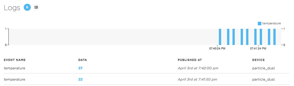 With the Flash button, the sketch is sent to the device and the device is rebooted. When the device comes up, it starts sending random values between 20 and 30 to the Particle Cloud. That can be checked using the Particle Console as shown below: