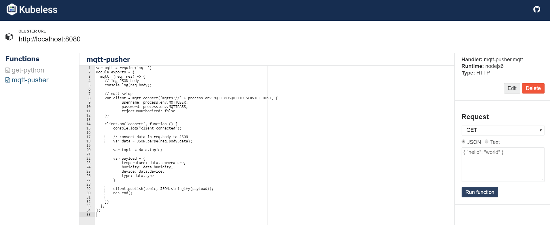 To edit the code, you can do so from kubeless-ui. You can also modify mqtt-pusher.js, delete mqtt-pusher and recreate the function with kubeless function create. If there errors in your code, the pod will fail to deploy. Use kubectl logs or the log viewer in kubeless-ui to check for errors.