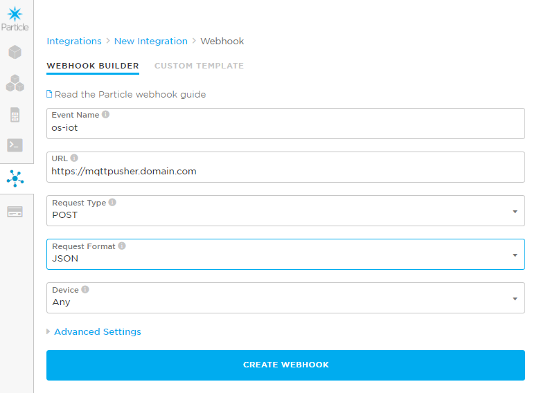 In the Particle Console, select Integration at the left and click New Integration. Select the Webhook type. Fill in the fields as below: