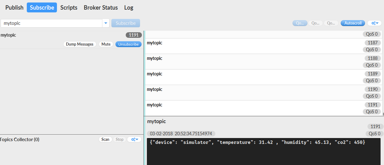 With MQTT.fx, you can subscribe to mytopic to see the following output:
